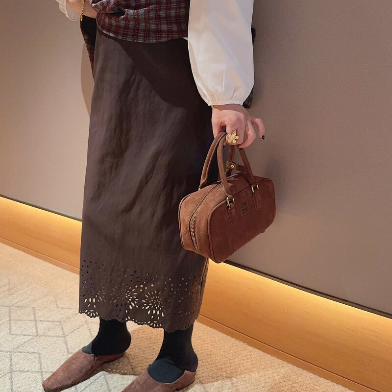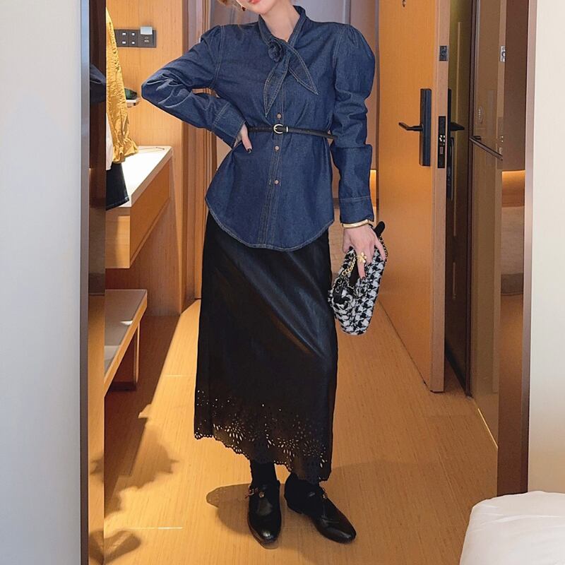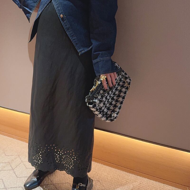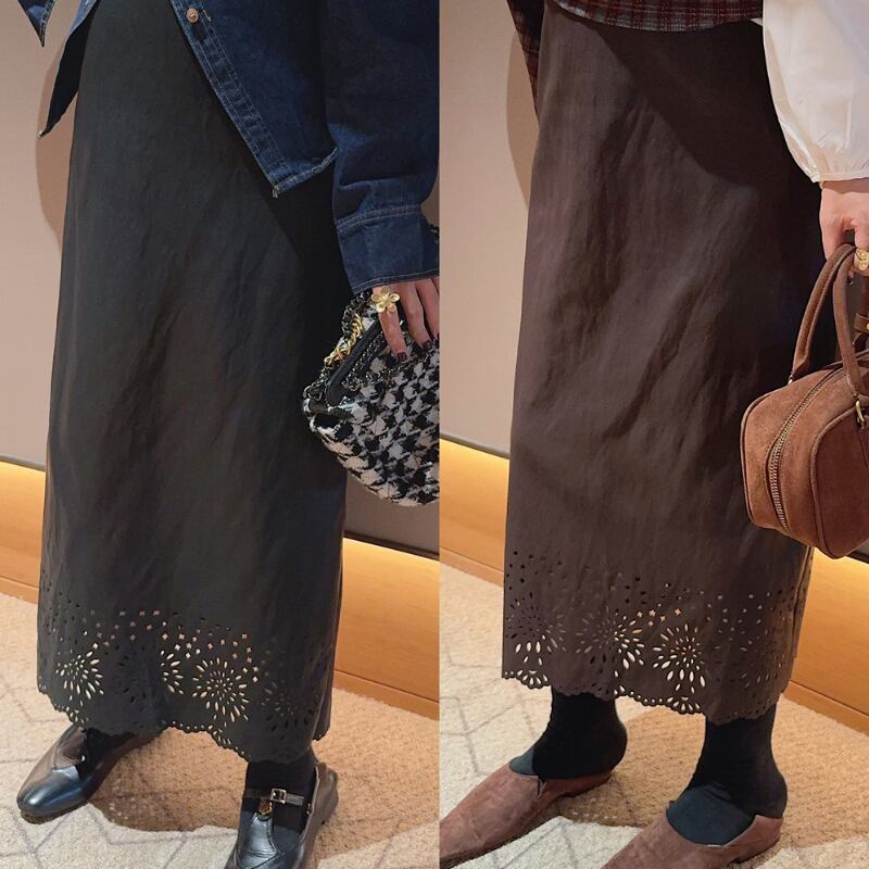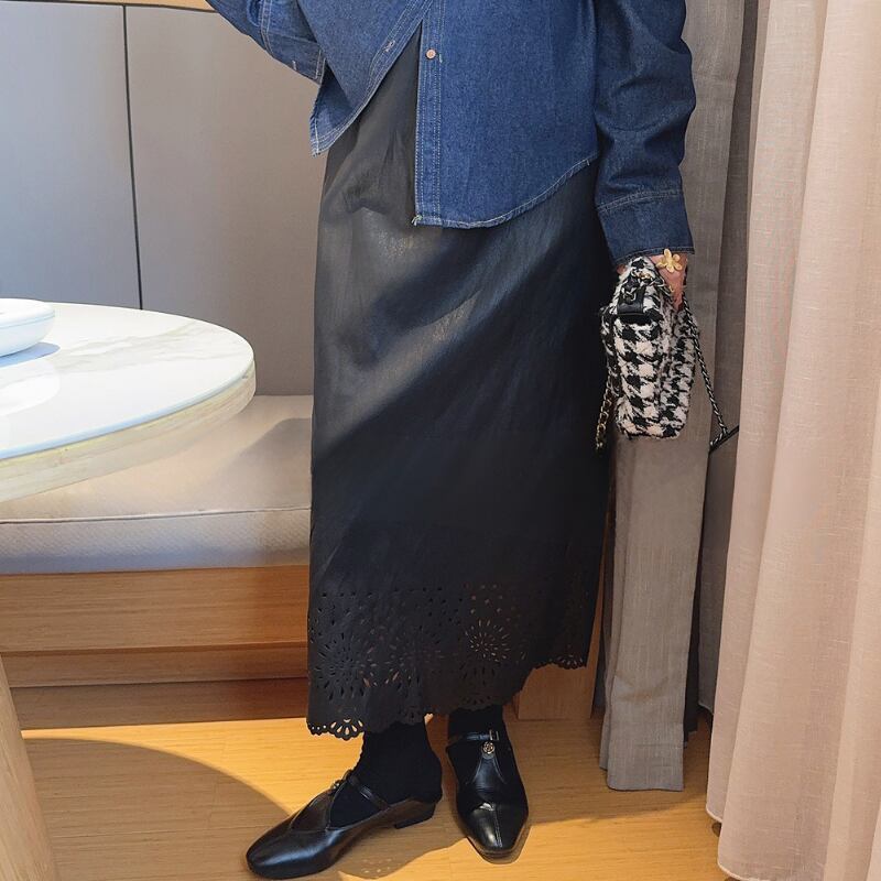 裾のカットワークデザインが目を引くフェイクレザーストレートスカート。ブラウスやニットと合わせて、オフィススタイルにも。