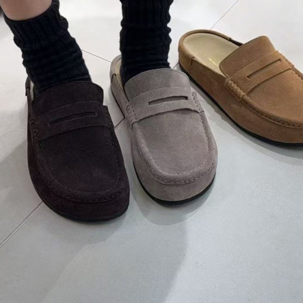 フラットソールで歩きやすく、ラフなスタイルに合わせやすいローファースリッポン。