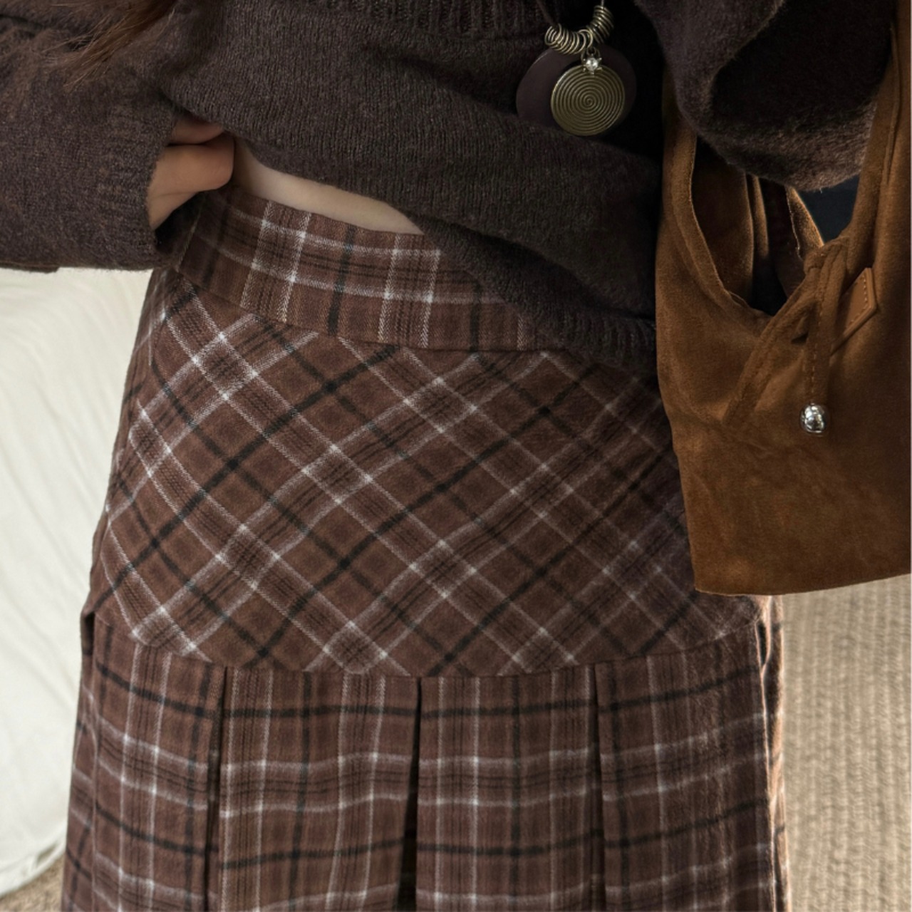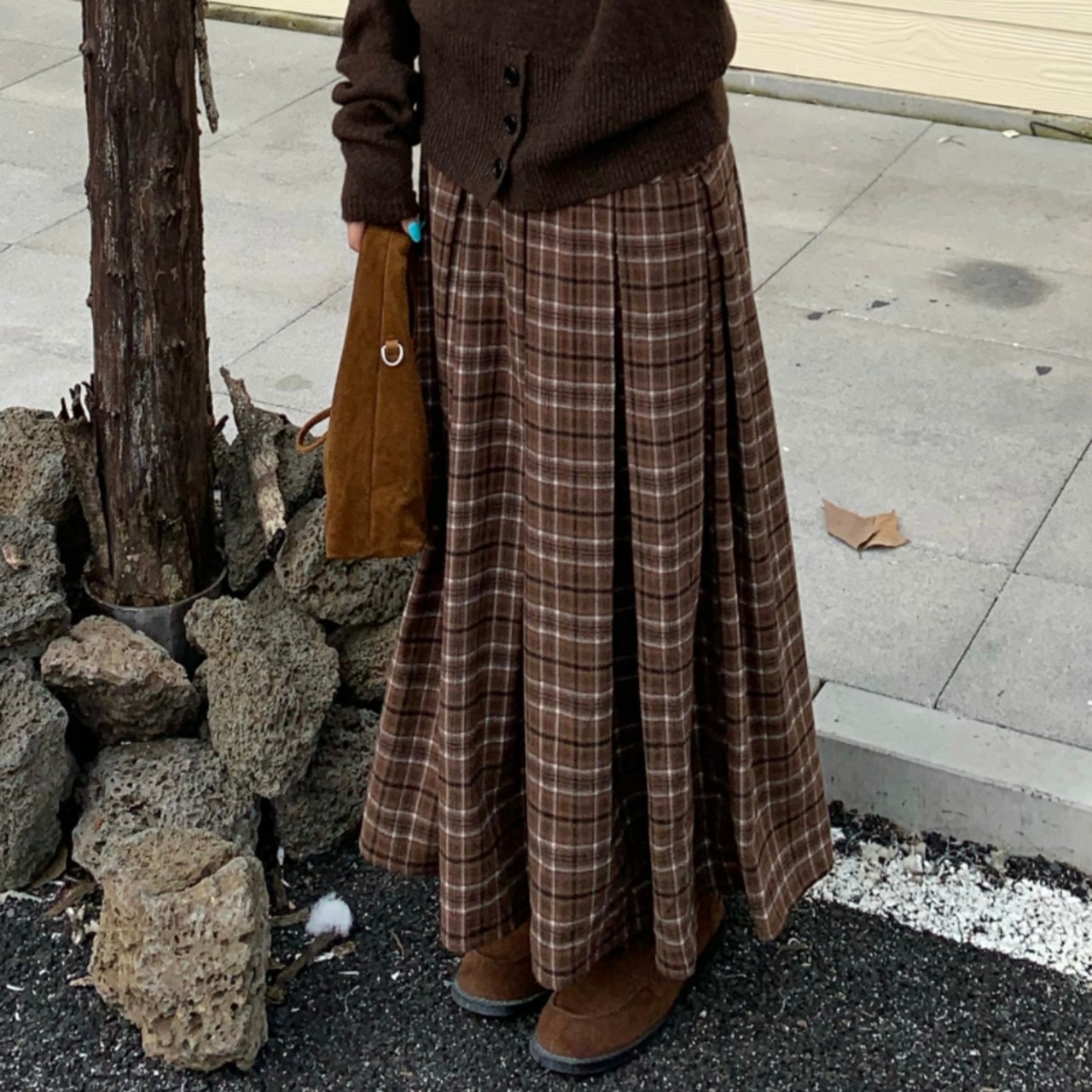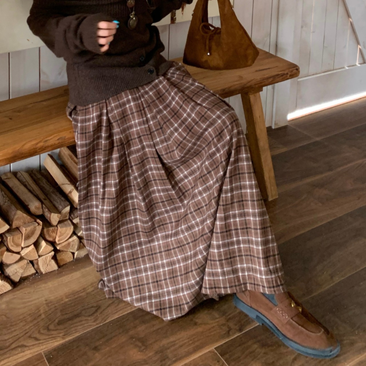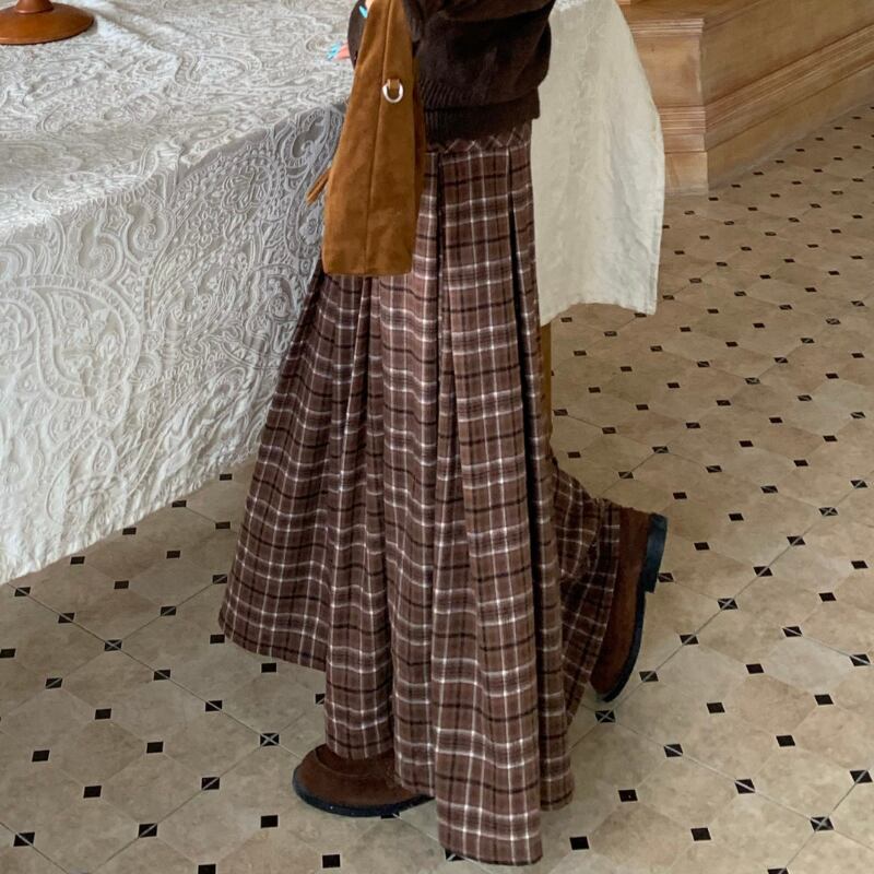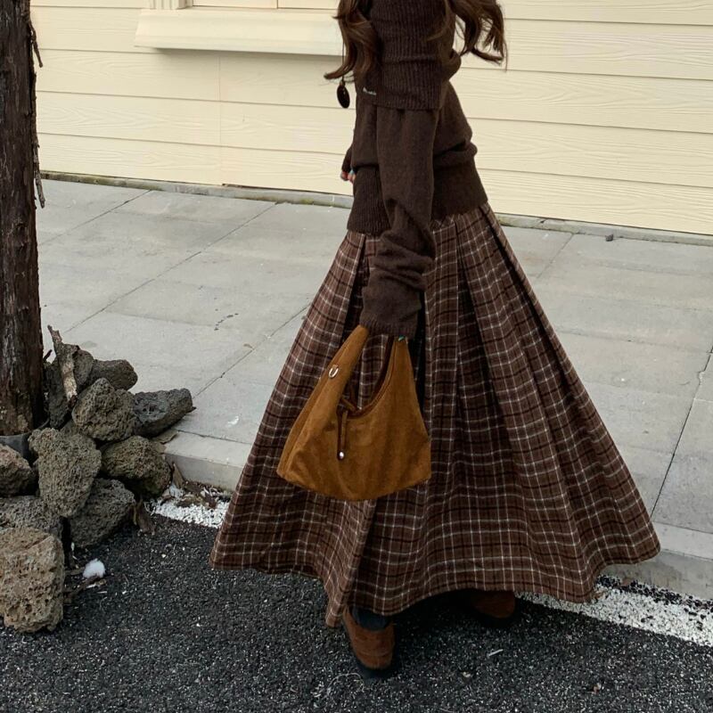 チェック柄が目を引くロングスカート。