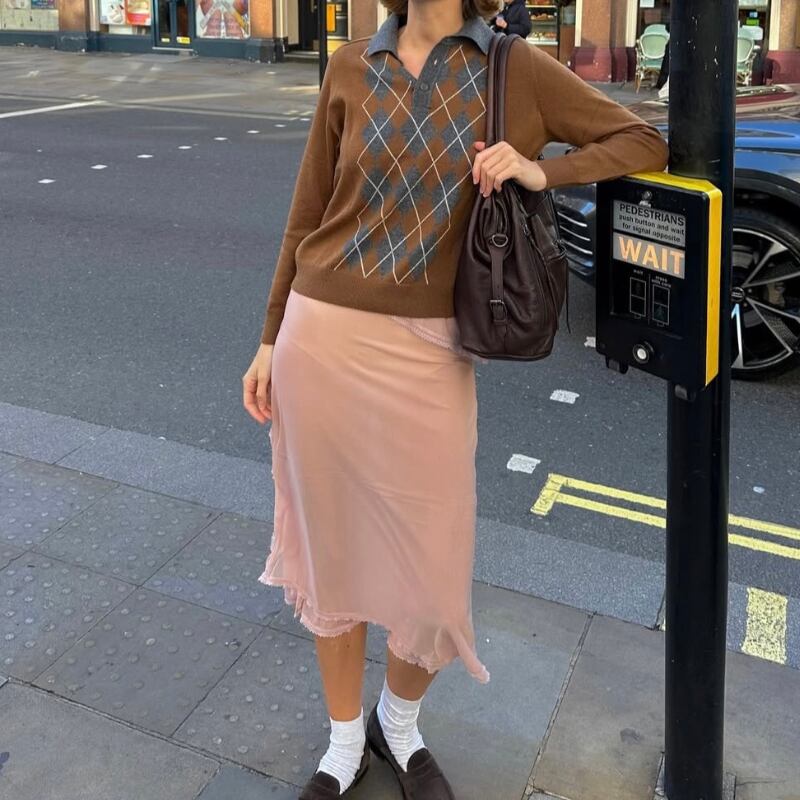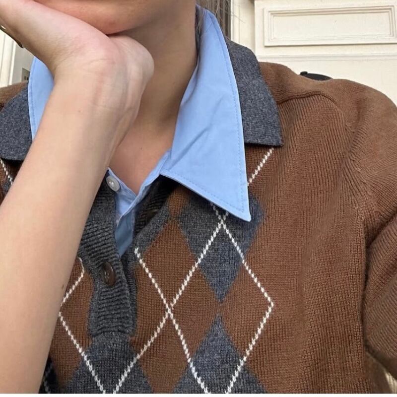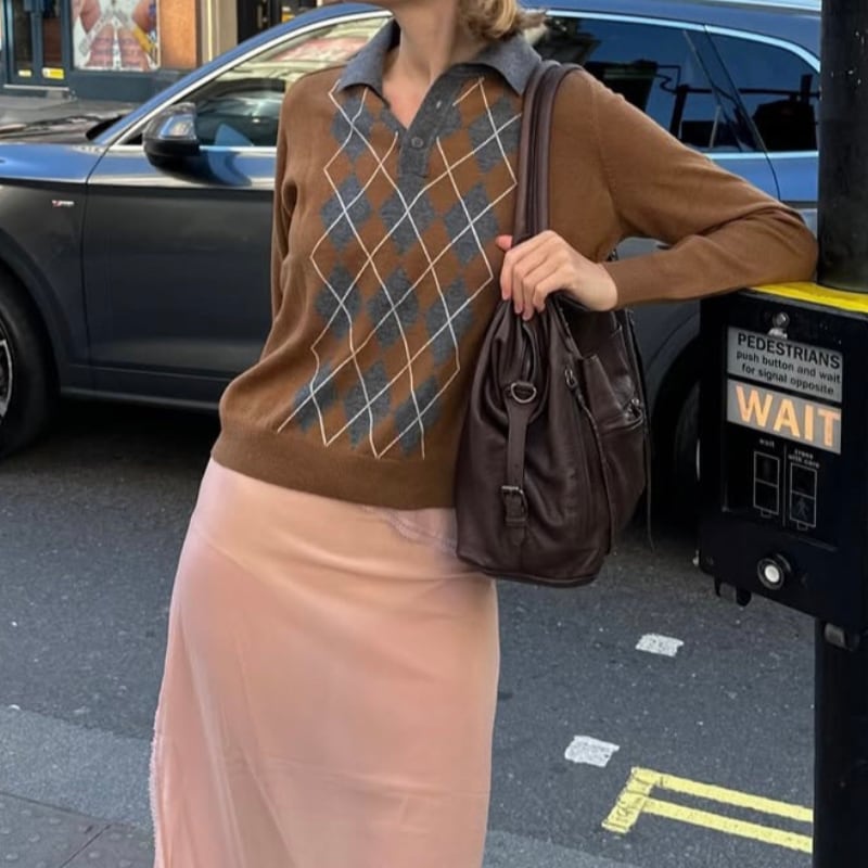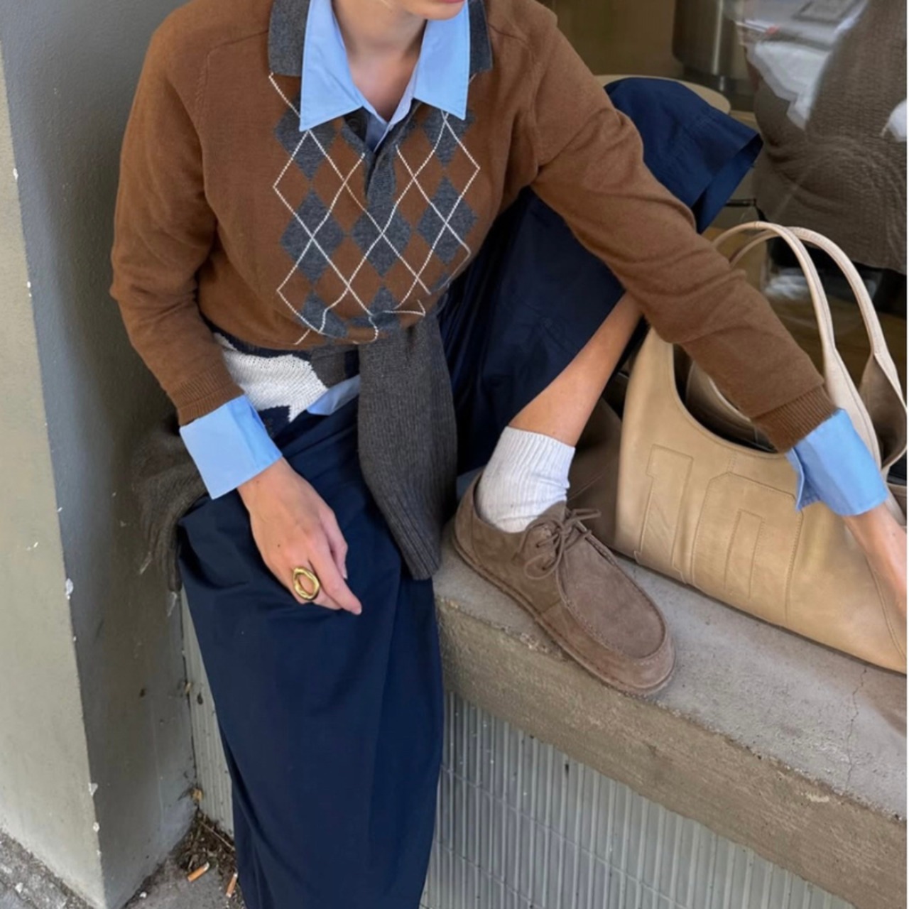 アーガイル柄がコーディネートのアクセントになるニットポロシャツ。