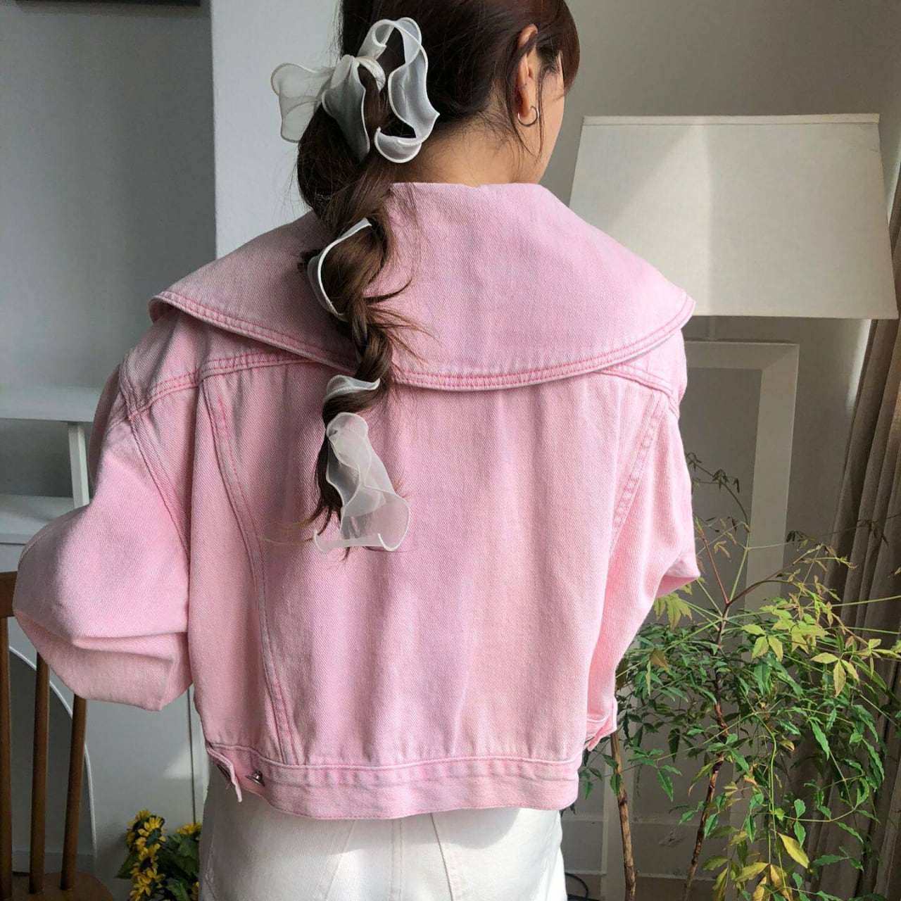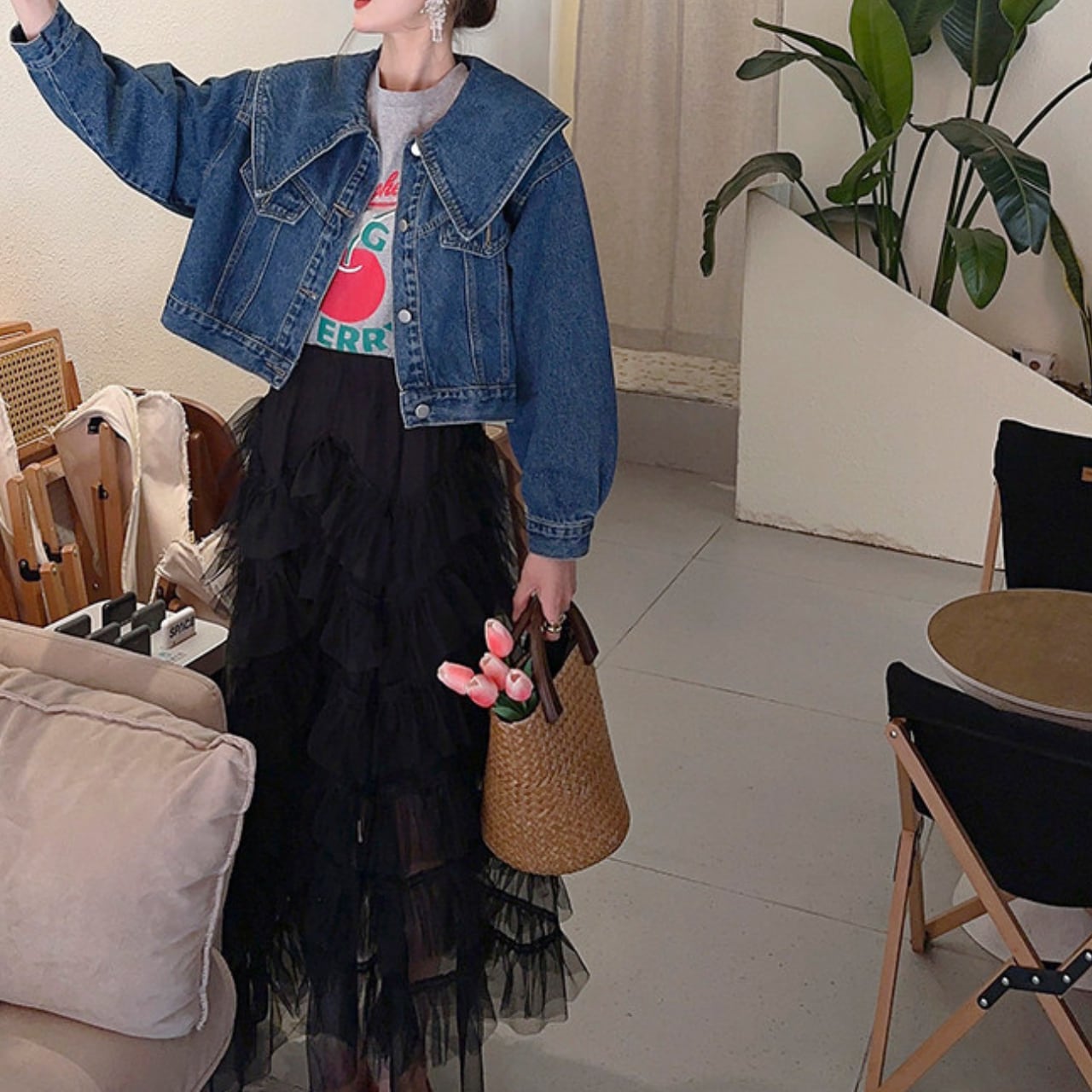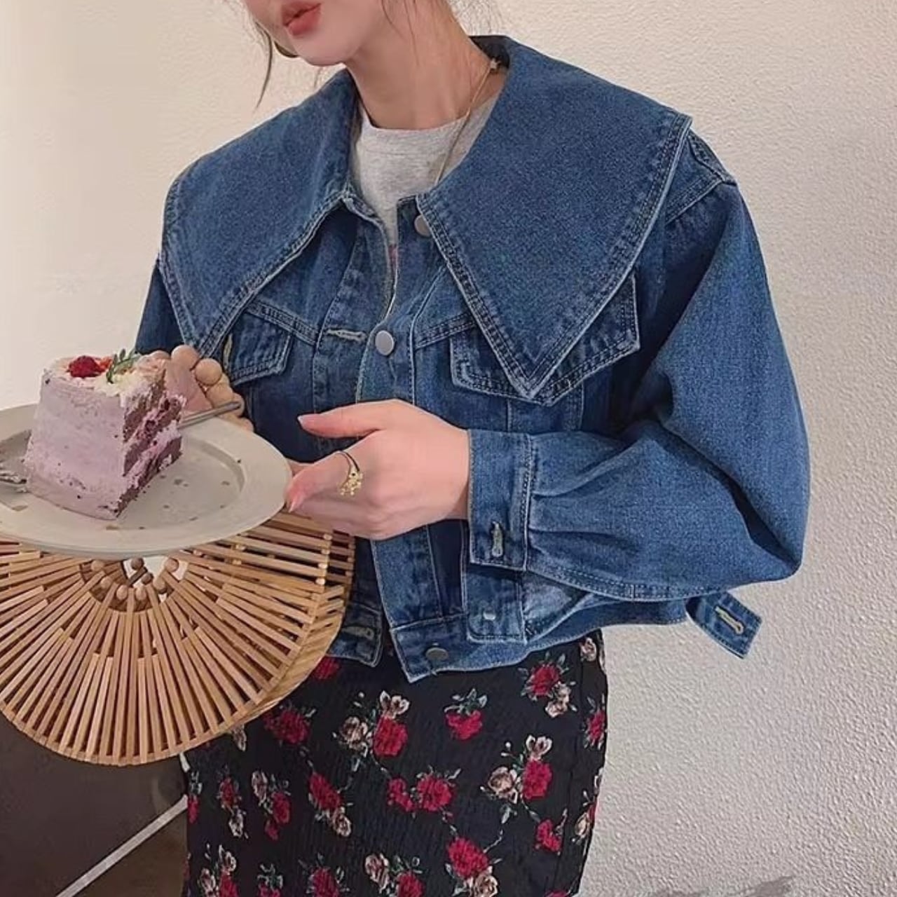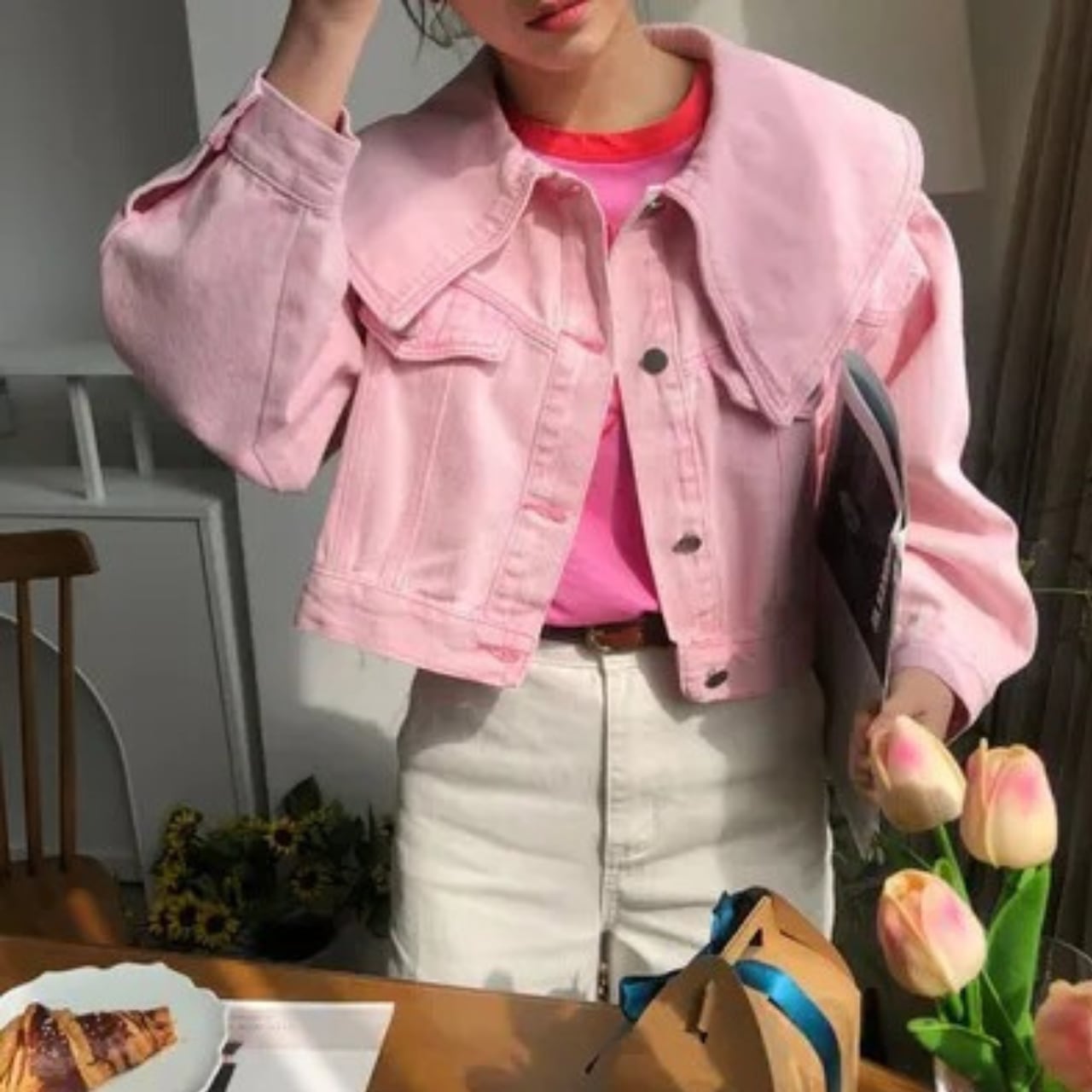 存在感のある襟が特徴で、着るだけでトレンド感溢れるスタイルになれるデニムジャケット。