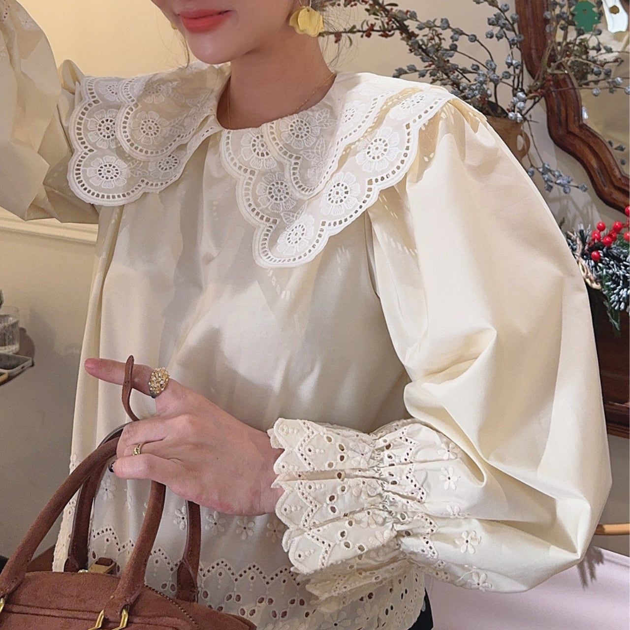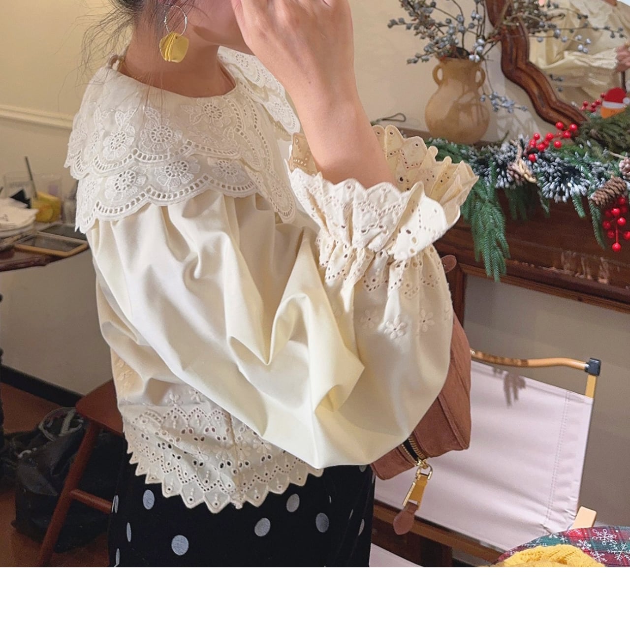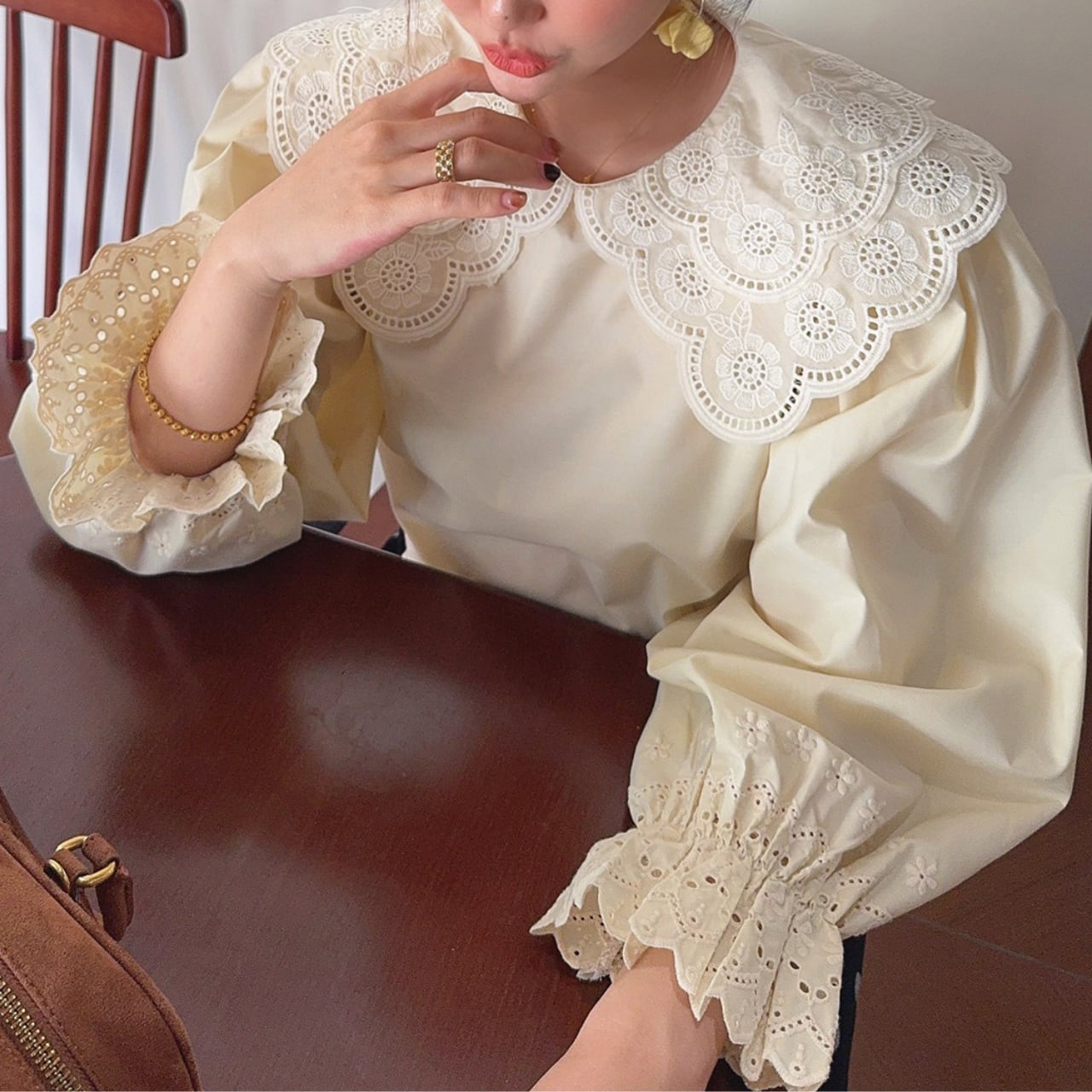 丸みのある襟と袖口のレースがフェミニンな雰囲気を演出。