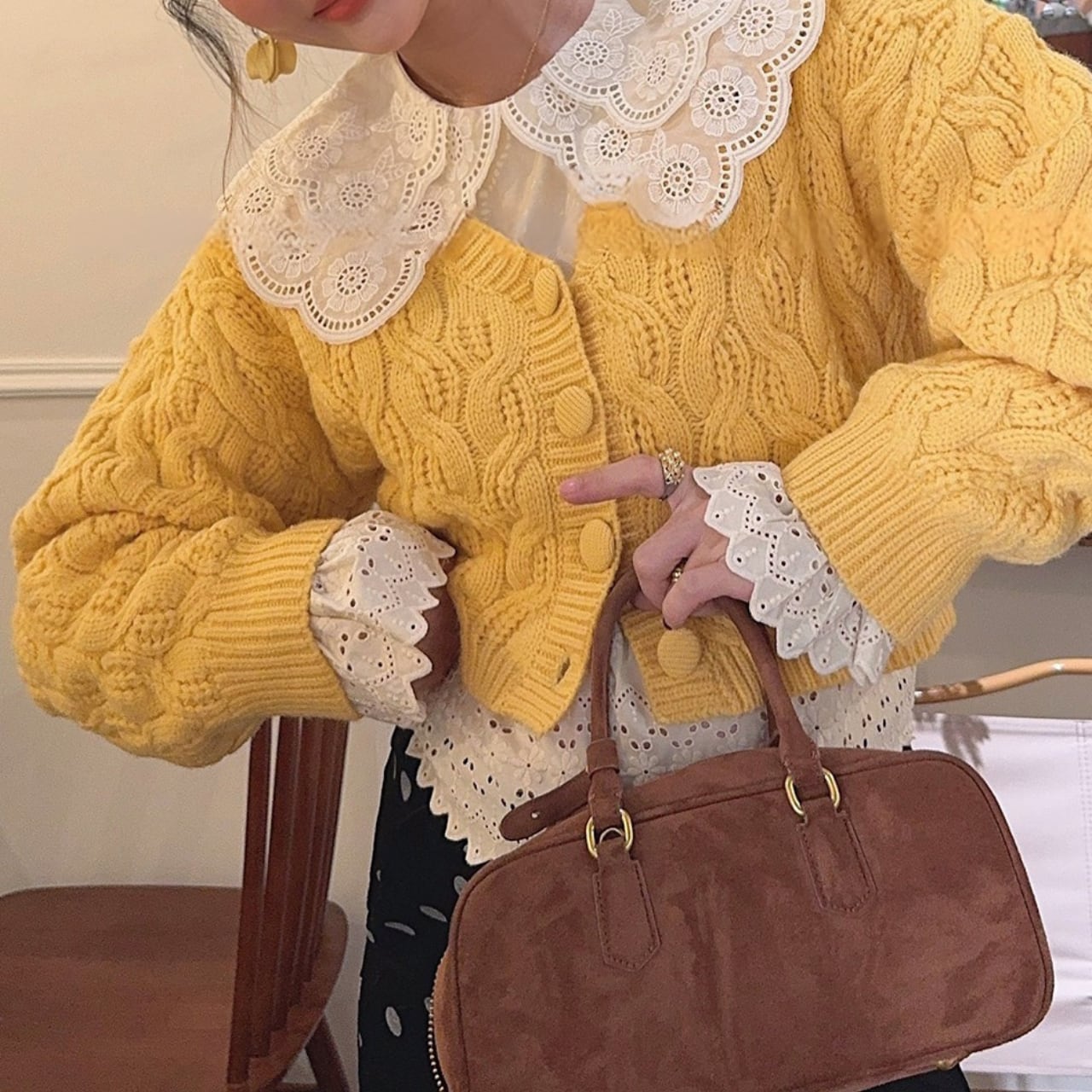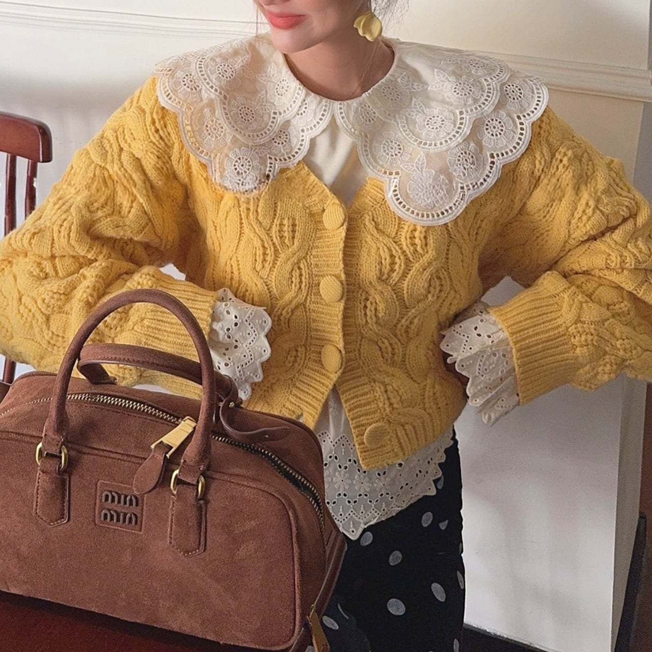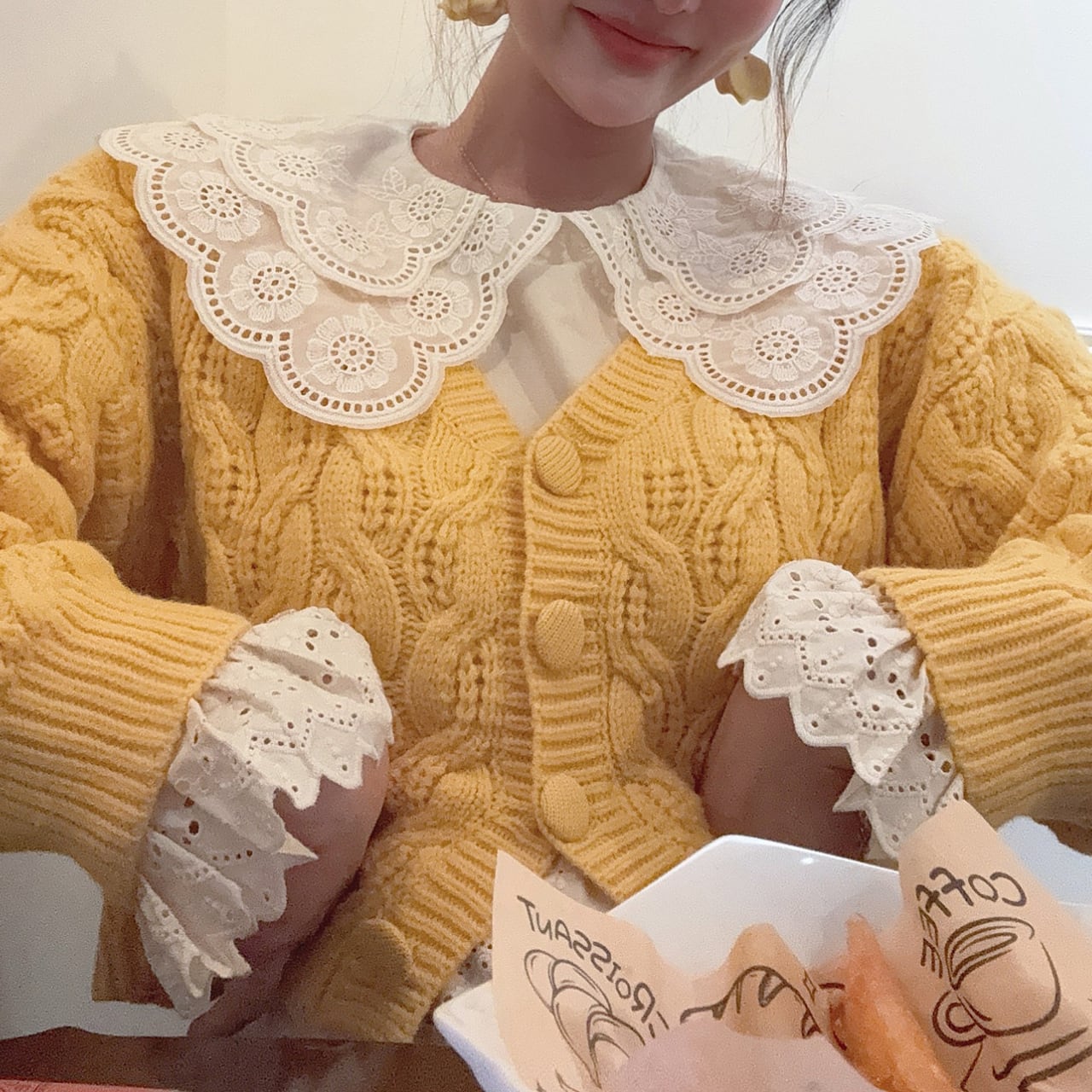 丸みのある襟と袖口のレースがフェミニンな雰囲気を演出。