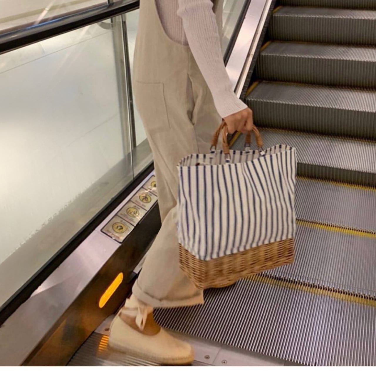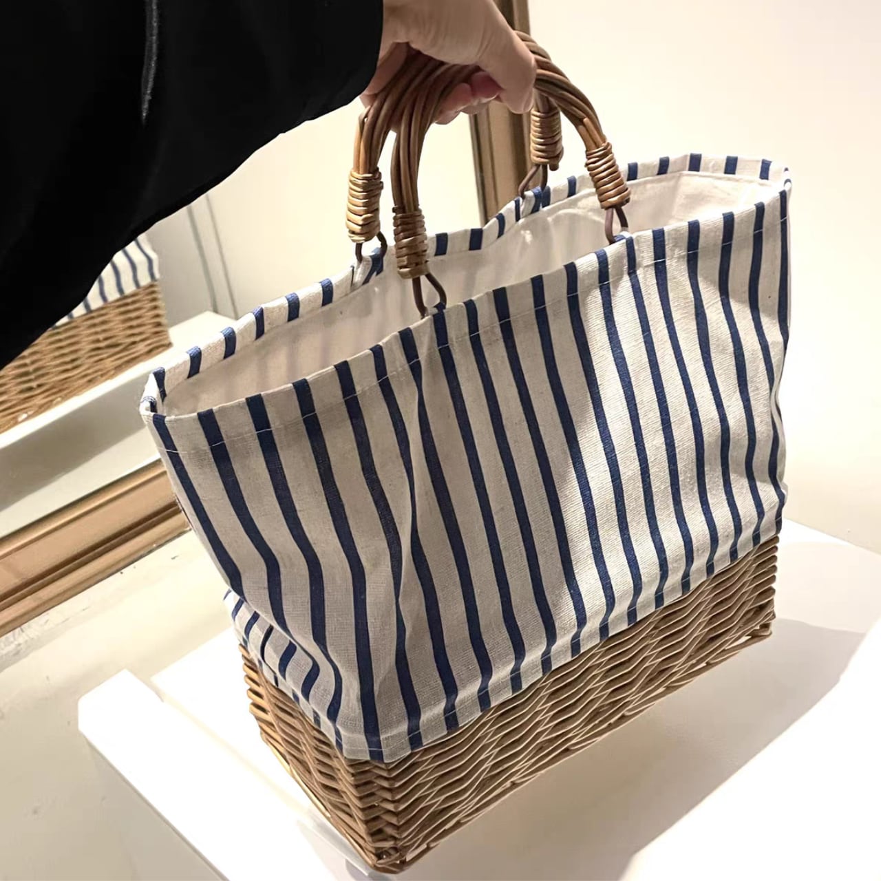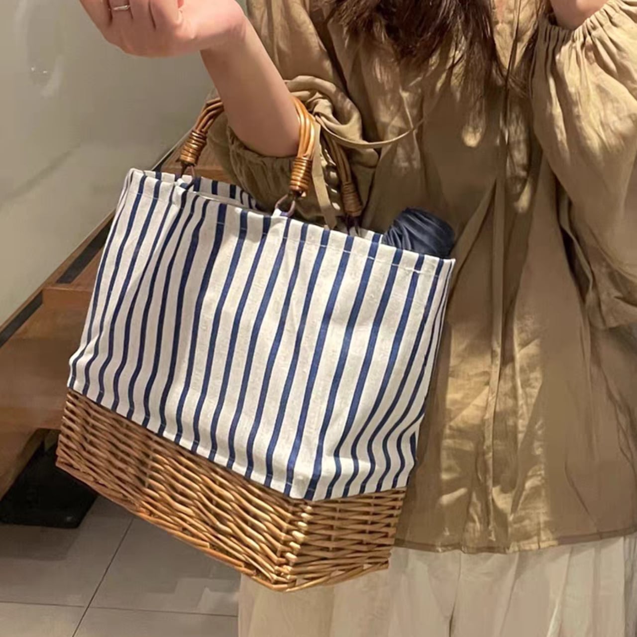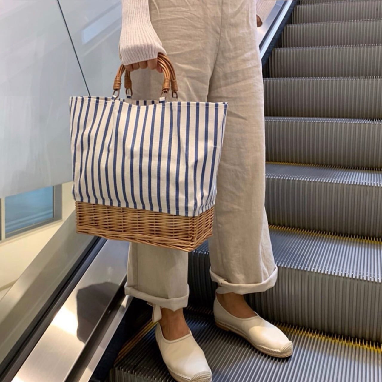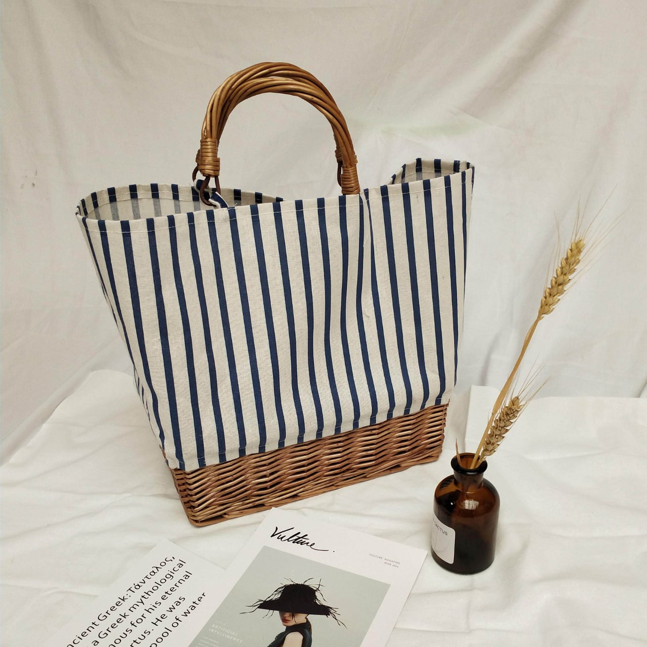 Stripe Canvas Rattan Tote Bag W00111