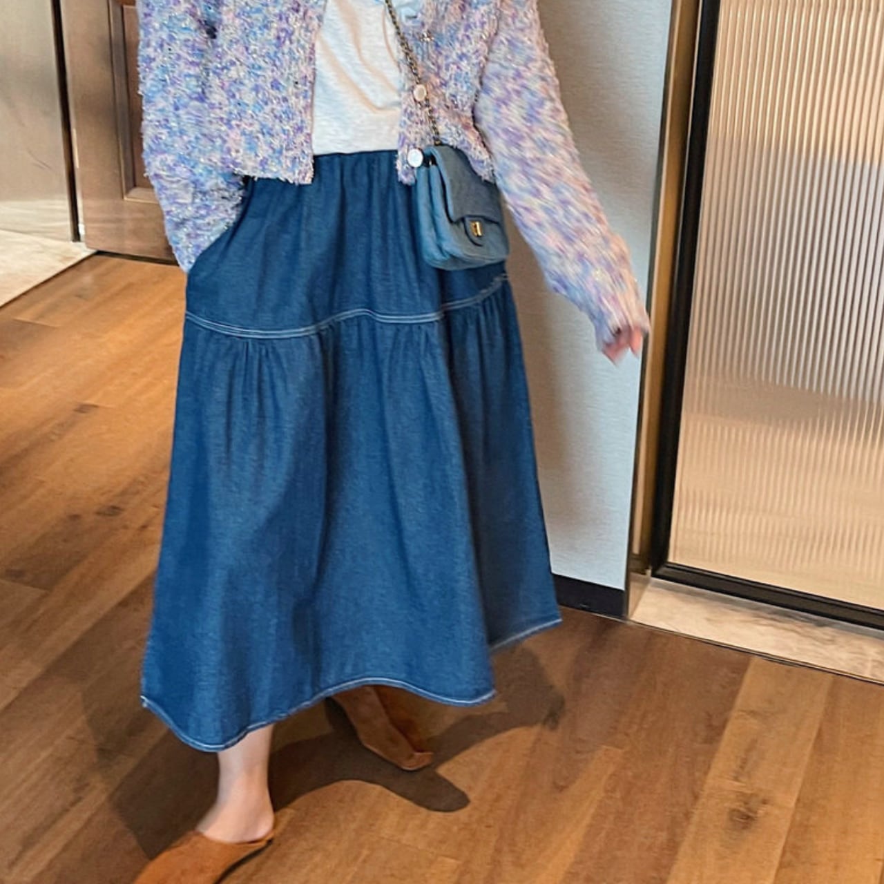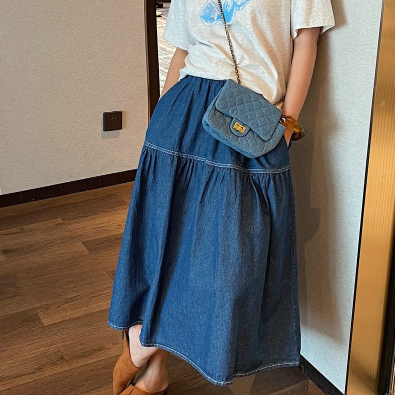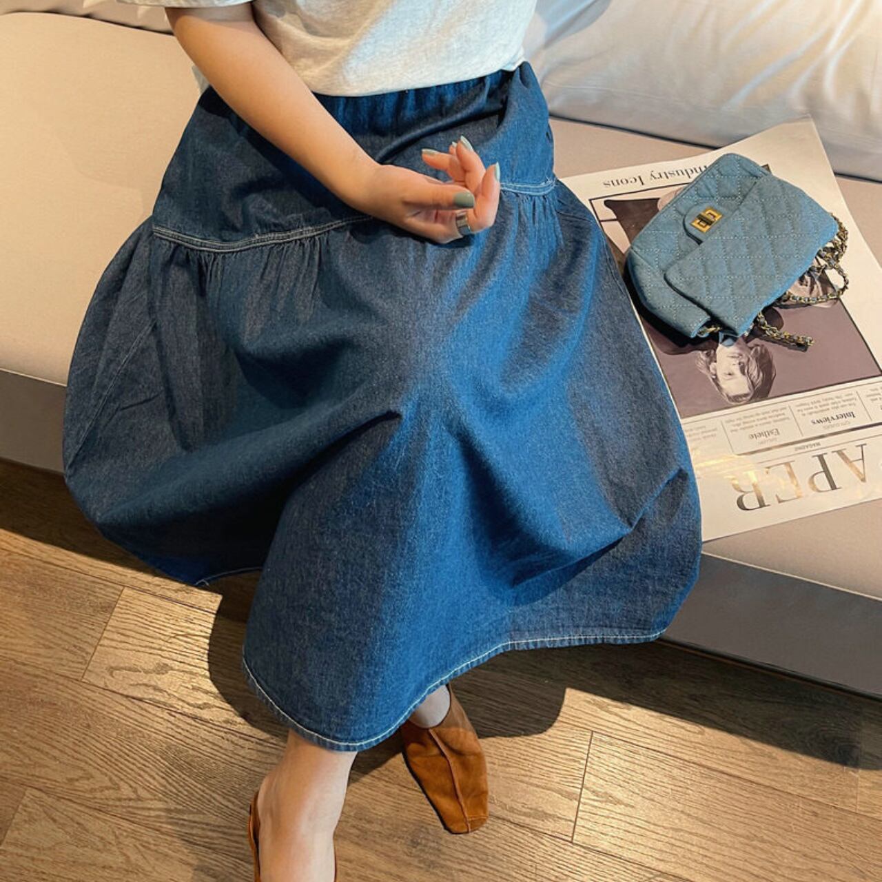 カジュアルなデニム素材ながらも、女性らしいシルエットで、普段使いからちょっとしたお出かけまで幅広く活躍します。