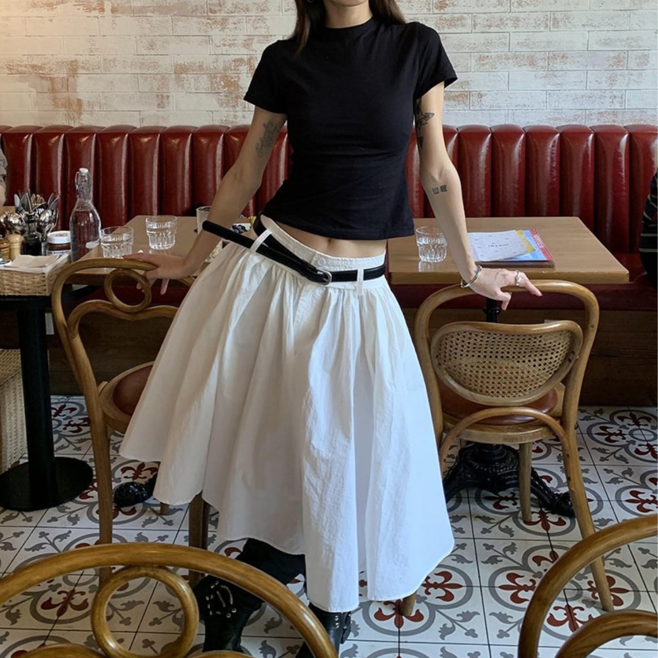 ベルト付きでウエストをきゅっと引き締め、メリハリのあるシルエットに。