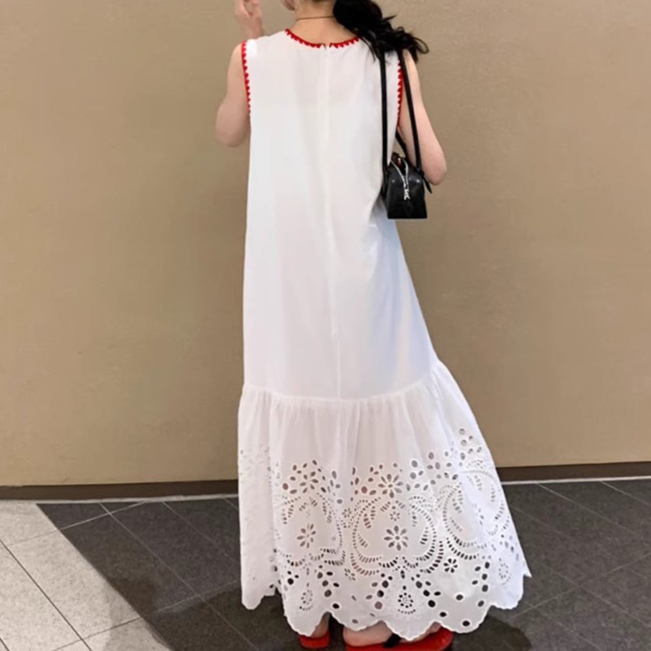 袖の刺繍と裾のレースデザインがポイントのワンピース。
