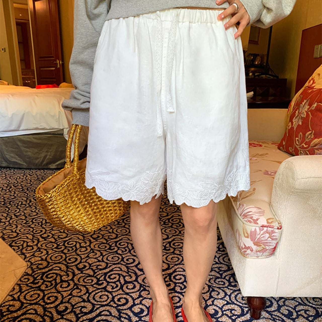 裾の刺繍がさりげないアクセントになり、普段のカジュアルスタイルにフェミニンさをプラス。 リラックス感のあるシルエットで、休日のリラックススタイルにはもちろん、 タウンユースにも活躍する一着です。 ■サイズ S 総丈:46cm ウエスト:60-90cm ヒップ:100cm M 総丈:47cm ウエスト:64-94cm ヒップ:104cm L 総丈:48cm ウエスト:68-98cm ヒップ:108cm 海外製品の為1〜3㎝誤差がある場合がございます。 【発送について】 当ショップの商品は海外からのお取り寄せとなります。 ご注文後に仕入れを行うため、 発送まで1週間〜3週間ほどお時間をいただいております。 ーーーーーーーーーーーーーーーーーー ■カラー ONE ■素材 リネン ◼️注意事項 ・こちらは輸入品となります。 日本製とは検品基準が異なる為、新品未使用品でも ごくわずかな汚れや傷がある場合もございます。 ・商品の色味は、お手持ちのデバイスの 画面によって実物と若干異なる場合がございます。 ———————————— ご購入前にこちらをお読みください → https://shop.maison-alea.com/about ————————————